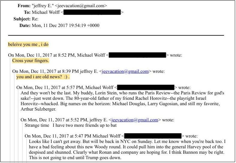 Wolff claimed he was trying to reach Epstein, but “obviously can’t do more than that.” Meanwhile, he’d sent the whole email thread to Epstein for review.