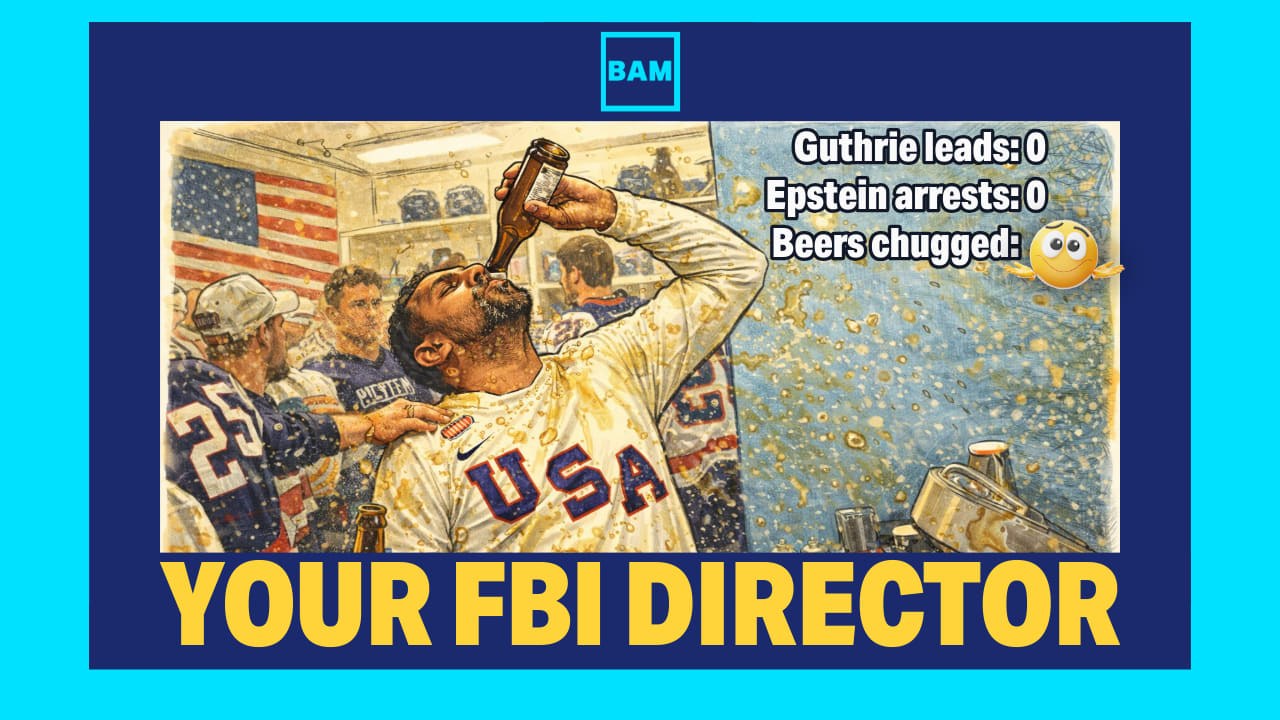 At first glance, this might seem like a trivial breach of decorum — a powerful official caught enjoying a national sports victory. But the optics and implications go deeper. The FBI director is not a drum major, nor a mascot, nor the fraternity president who bangs the keg to ensure equal distribution. The FBI director is, at least in theory, the sober guardian of the nation’s laws — a man entrusted with counterintelligence, counterterrorism, the challenges of organized crime, and the obligation to help release ALL of the Epstein files. The FBI Director should embody seriousness and stability. The position does not include “assistant equipment manager, post-victory lager division.”