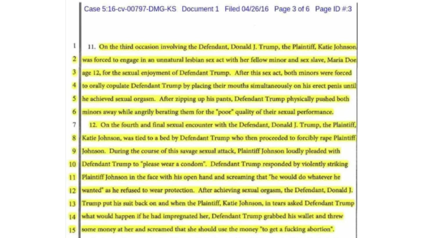 Jane Doe #4 also matters because she establishes that Trump allegedly acted in a pattern. While Jane Doe #4 alleges Trump raped in the 1980’s, a separate accuser known as Katie Johnson alleged that Trump raped her as a minor in the 1990’s.