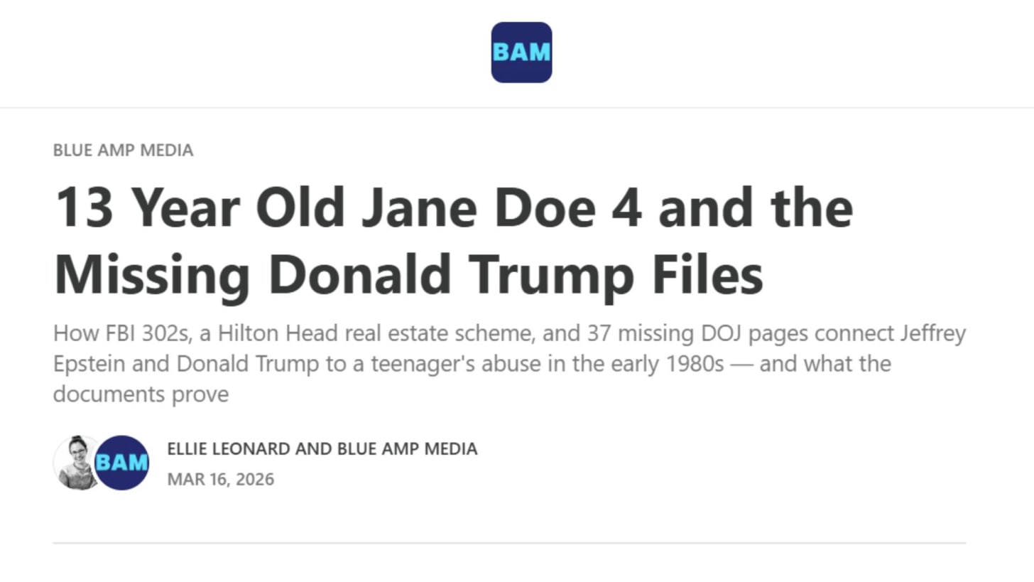 Within that context, the reporting in Ellie Leonard’s Substack report can not be dismissed. Here we have yet another Epstein survivor who told investigators she was trafficked to powerful men and raped by Donald Trump. The FBI found Jane Doe #4 credible. And there are still 37 pages from the FBI interview documents of Jane Doe #4 that are still being withheld.