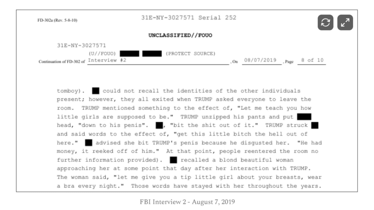 As for the incendiary high profile allegations, Jane Doe #4 spoke to the FBI about being taken to NYC and sexually assaulted by Donald Trump.